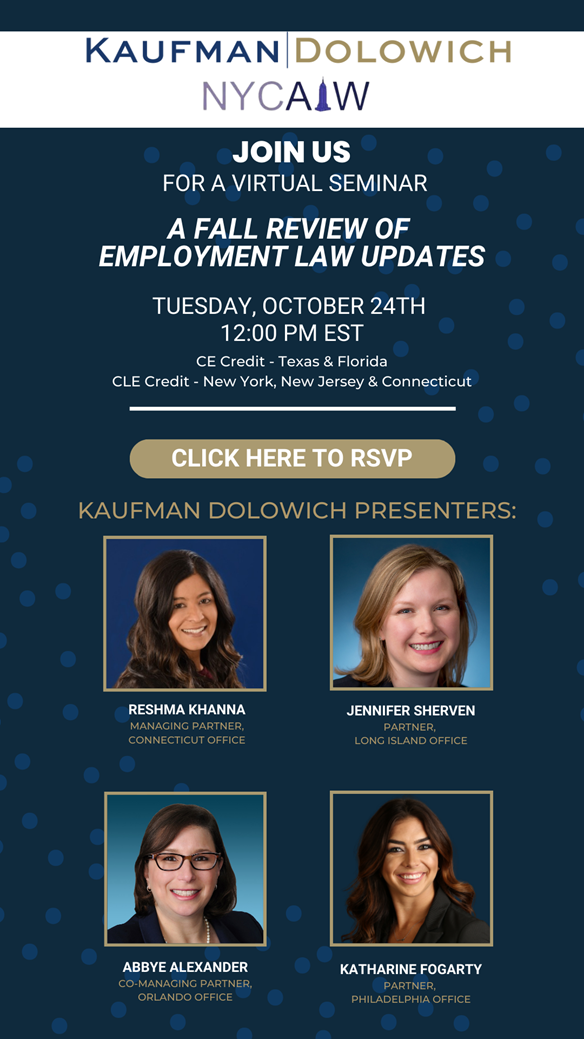 JOIN US FOR A VIRTUAL SEMINAR A FALL REVIEW OF EMPLOYMENT LAW UPDATES TUESDAY, OCTOBER 24TH 12:00 PM EST CE Credit – Texas & Florida CLE Credit – New York, New Jersey & Connecticut KAUFMAN DOLOWICH PRESENTERS: RESHMA KHANNA MANAGING PARTNER, CONNECTICUT OFFICE JENNIFER SHERVEN PARTNER, LONG ISLAND OFFICE ABBYE ALEXANDER CO-MANAGING PARTNER, ORLANDO OFFICE KATHARINE FOGARTY PARTNER, PHILADELPHIA OFFICE